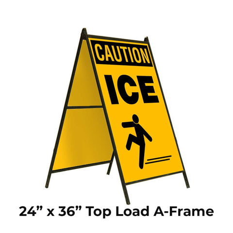 Caution Ice with a graphic of a Person Sliding A-Frame Sign Stand