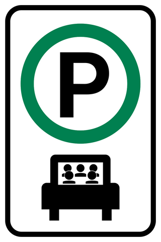 This Carpool parking sign is a rectangle sign. It has a parking permitted symbol and black graphic of a vehicle on a white background.