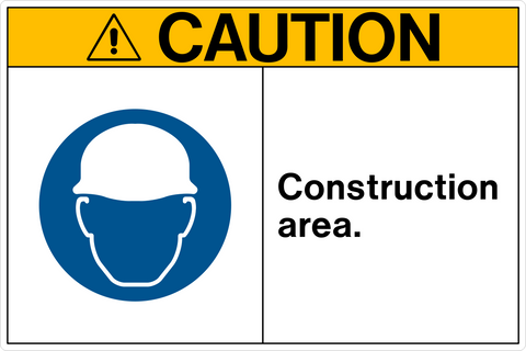 A caution sign with a blue pictogram of a hard hat and the text 'CONSTRUCTION AREA.' OSHA Layout