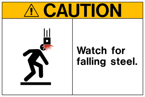 Alert workers to falling debris hazards with this Falling Steel OSHA Caution Sign. Ideal for construction zones, warehouses, or steelworks. Fully customizable in material and size to meet your safety requirements.