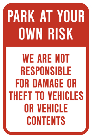 A Park at Your Own Risk Parking Sign ensures clear communication and safety in any parking area. Made from durable aluminum or reflective aluminum, it offers high visibility and long-lasting performance.