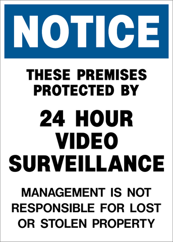 Notice These Premises protected by 24 Hour Video Surveillance Management is not responsible for Lost or Stolen Property